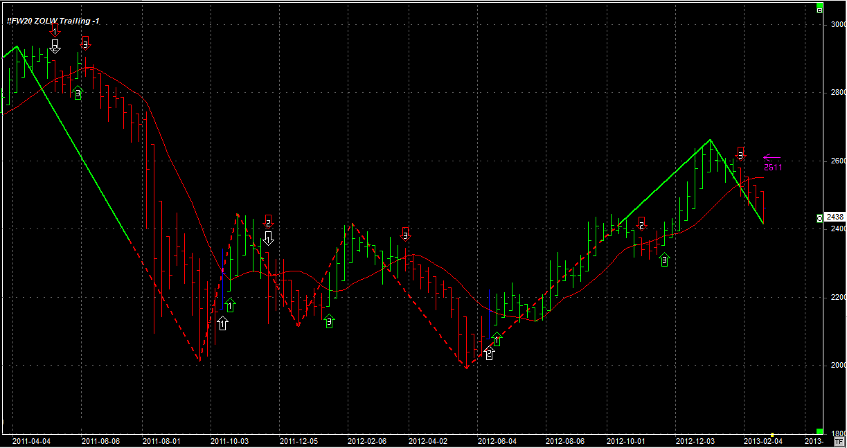 System zajmuje jedną krótką pozycję (przeciw trendowi) po 2514 pkt. Stop dla pozycji krótkiej 2611 pkt.