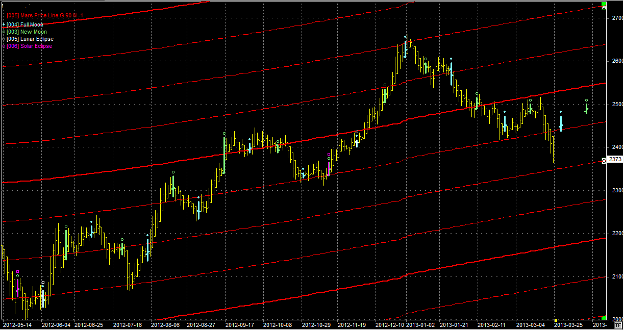 Na wykresie z liniami Marsa kurs porusza się ostatnio z dużą dokładnością pomiędzy wsparciami i oporami wyznaczonymi przez trajektorię planety. Po przełamaniu wsparcia w okolicach 2420 pkt kurs kontraktów, zgodnie z prognozą, podąża w kierunku kolejnego wsparcia na linii położonej w okolicach 2350 pkt. Brakuje niewiele więc sądzę, że w tym tygodniu poziom ten będzie testowany. Spodziewam się, że pierwszy test będzie zakończony odbiciem. Jego siła pokaże, na ile niedźwiedzie są silne i czy odbicie będzie trwalsze, czy skończy się nic nieznaczącymi podrygami, jak w okolicach 2600 pkt.