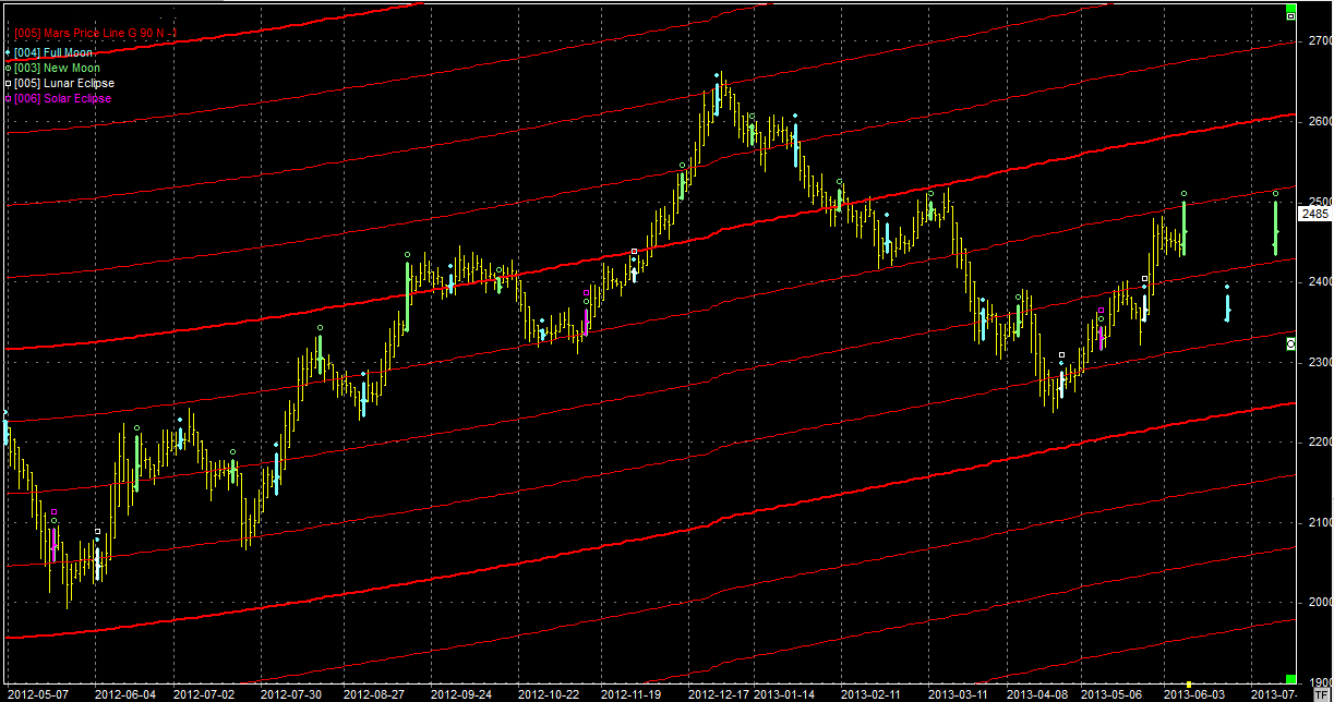 Na wykresie z liniami Marsa jesteśmy ponownie na oporze na linii położonej obecnie w okolicach 2500 pkt. Jest to już drugi atak i ten powinien być uwieńczony powodzeniem. Sielankę burzy jednak sobotni Nów, który jest aspektem zwrotnym, więc jeżeli oporu nie pokonamy to czeka nas cofnięcie. Moim zdaniem nawet od 2 piętra. Trochę jednak dziwne byłoby gdyby byki nie chciały dowieźć wyniku do zamknięcia serii. Rolowanie pozycji to obecnie 80 pkt straty na dzień dobry.