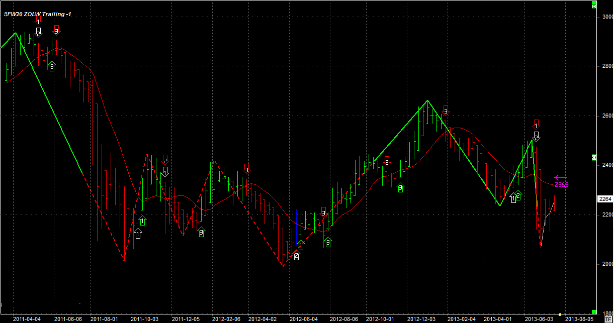 Tydzień zamknął się na poziomie 2264 pkt, 15 pkt wyżej niż tydzień temu. System utrzymuje 1 krótką pozycję po 2165 pkt. Stop na poziomie 2352 pkt.