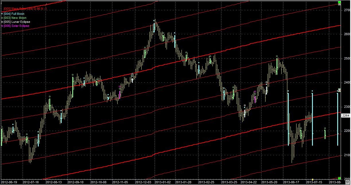 Na wykresie z liniami Marsa byki nadal nie mogą uporać się z oporem na linii położonej w okolicach 2260 pkt. Skoro nie może być wyżej, to będzie niżej. W poniedziałek mamy pełnię. Poprzednia była wręcz paniczna, co pokazuje znacznik pełni o długości ruchu poprzedniego. Jest to element zwrotny, więc jeżeli ma być niżej to minimum ruchu to okolice niższej linii Marsa, położonej w okolicach 2200 pkt.