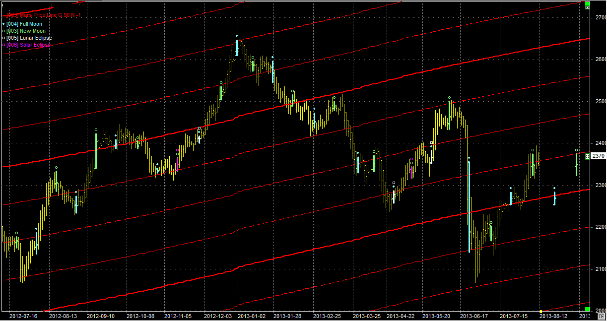 Na wykresie z liniami Marsa trwa walka na oporze położonym obecnie na poziomie 2370 pkt. Wtorkowy nów spowodował tylko jednodniowe odejście od maksimów, tak więc nie zawrócił indeksu a jedynie zatrzymał. W takiej sytuacji widzę szanse na podejście w okolice kolejnego oporu położonego na linii Marsa w okolicach 2450 pkt. Warunkiem jest pokonanie obecnego, co nie jest przesądzone. Początek tygodnia musi tę sprawę rozwiązać. Cofnięcie wprowadzi niepokój wśród byków i może skutkować odwrotem.