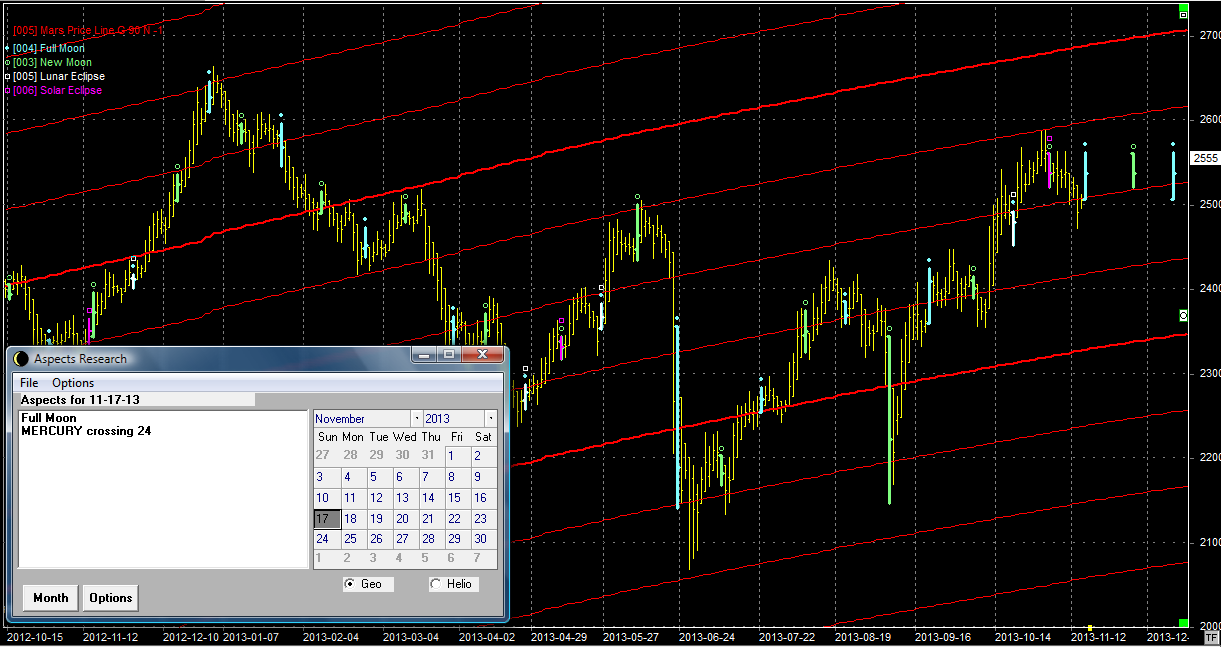 Na wykresie z liniami Marsa, po nieudanym teście oporu na poziomie 2580 pkt, mieliśmy klasyczne zejście do pierwszej linii wsparcia. Wsparcie zostało wybronione więc szykuje się kolejny atak na opór, który obecnie jest już na poziomie 2600 pkt (linia Marsa unosi się ku górze). Jego pokonanie to dalszy marsz w kierunku poziomu 2680 pkt. Wg mnie są duże szanse na jego pokonanie. Płytkość ostatniej korekty dobrze świadczy o kondycji byków. Trochę niepokoi niedzielna pełnia, która może być elementem zwrotnym, ale czy tak będzie przekonamy się już w poniedziałek.
