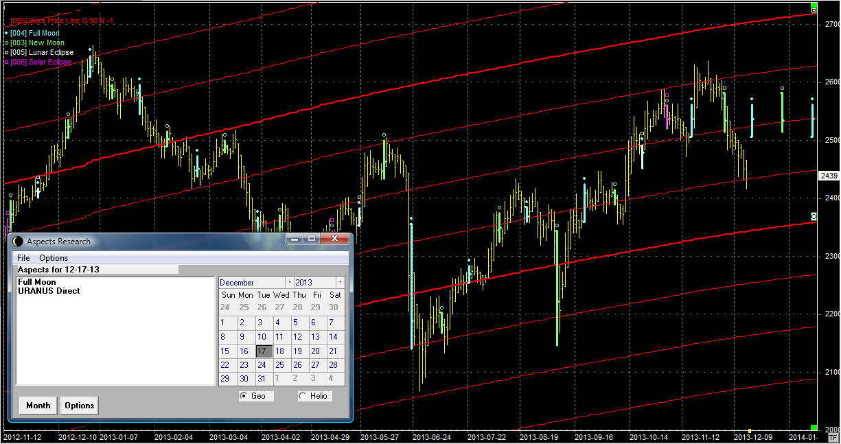 Na wykresie z liniami Marsa przełamanie wsparcia na poziomie 2520 pkt skutkowało szybkim zjazdem o 100 pkt niżej. Obecnie jesteśmy znowu na wsparciu, tyle że niższym. Niestety mleko się rozlało i sekwencja coraz wyższych dołków została zaburzona. Trend został więc złamany, a to może skutkować pogłębieniem spadków w dłuższym terminie. Na razie jednak rynek jest dość solidnie wyprzedany, więc ze wsparcia powinno zostać wyprowadzone odbicie wzrostowe. Niestety, moim zdaniem, tylko odbicie z zasięgiem w okolicach linii Marsa na 2520 pkt, która jest teraz oporem. Nim tam dojdziemy będzie najprawdopodobniej 10 pkt wyżej, gdyż się unosi. Niższe odbicie po takim spadku trzeba będzie uznać za wyjątkową słabość rynku. We wtorek mamy pełnię. Bardzo dobry moment na uklepanie dna i zmianę kierunku.