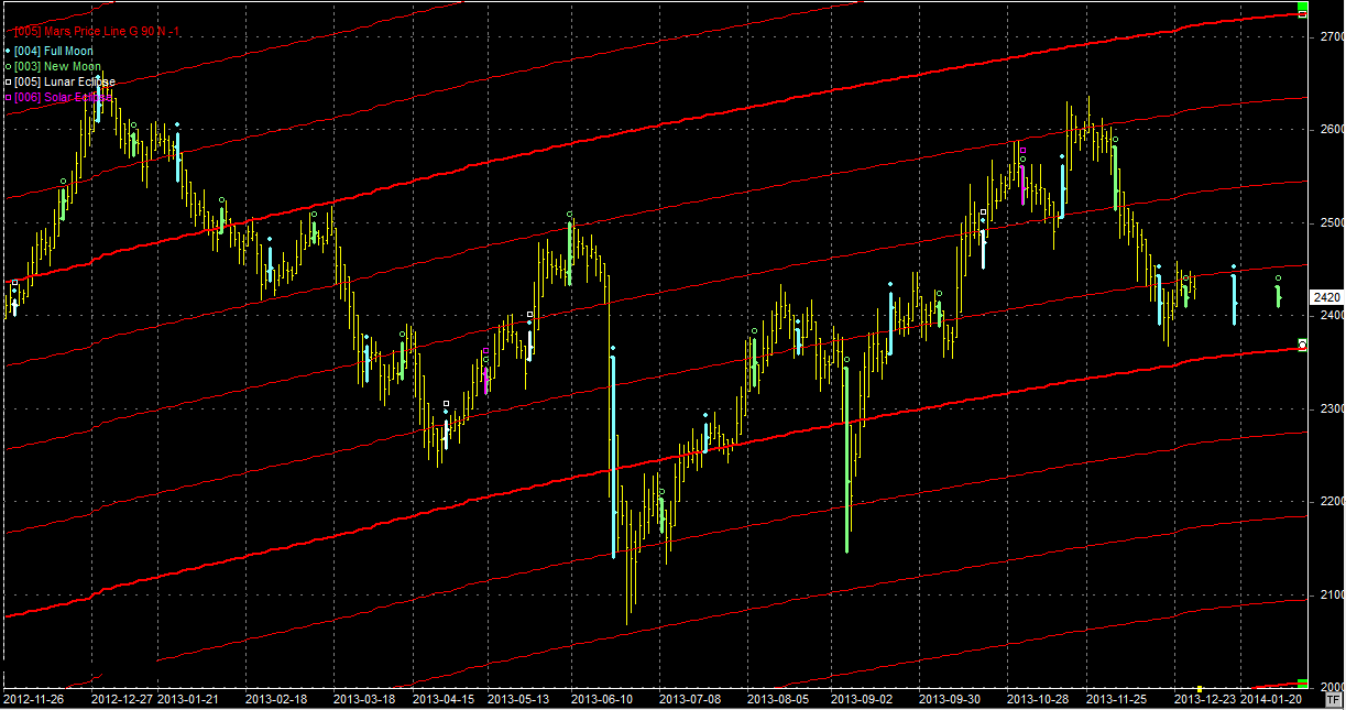 Na wykresie z liniami Marsa dotarliśmy do pierwszego oporu na poziomie ok 2450 pkt, z którym nie bardzo możemy sobie poradzić. Jeżeli nie stanie się to na początku tygodnia to wkradnie się zniechęcenie, co może skutkować zejściem do wsparcia na poziomie 2380 pkt, lub nawet poniżej 2300 pkt. W przypadku udanego trzeciego ataku na opór, którego na razie nie wykluczam, następny opór znajduje się na poziomie 2550 pkt.