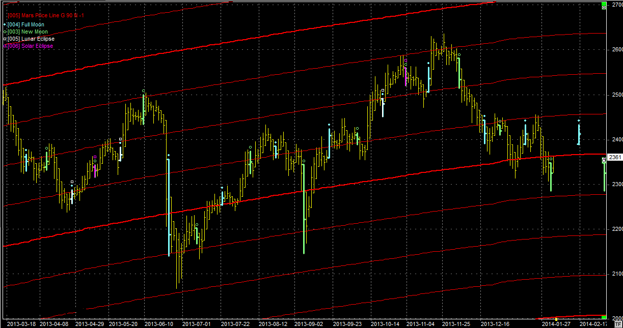 Na wykresie z liniami Marsa dotarliśmy w mijającym tygodniu praktycznie do wsparcia na 2380 pkt. Zabrakło 6 pkt, ale można to wg mnie traktować za test. Następnie od minimów byki wyprowadziły kontrę. Miało to miejsce dokładnie na Nowiu, co daje wiarygodność ruchowi. Wg mnie mamy szanse na ruch do następnego oporu, położonego na poziomie 2460 pkt. Zakładam, że z obecnym, położonym 100 pkt niżej, uporamy się na początku tygodnia. Gdyby nie, to taki zwrot będzie bardzo źle przyjęty, spowoduje zawód i spotęguje wyprzedaż. Reasumując, skuteczne pokonanie oporu na obecnym poziomie daje szanse na co najmniej 100 punktowy ruch w górę.