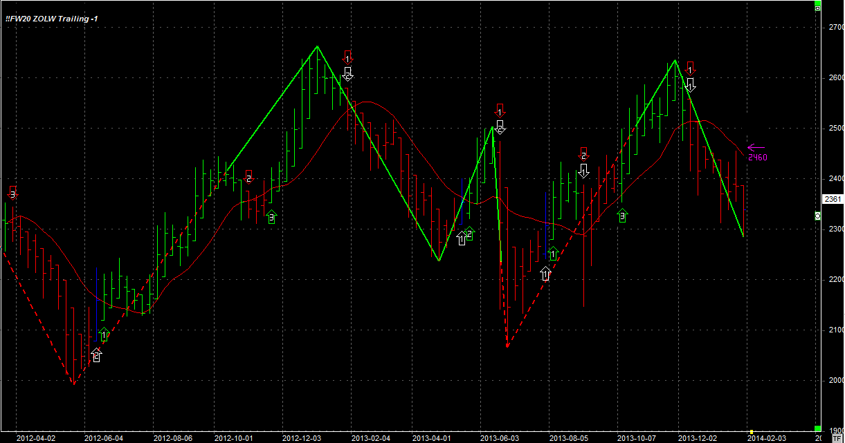 Tydzień zamknął się na poziomie 2361 pkt, 7 pkt wyżej niż tydzień temu. System utrzymuje jedną krótką pozycję po 2439 pkt. Stop 2460 pkt.