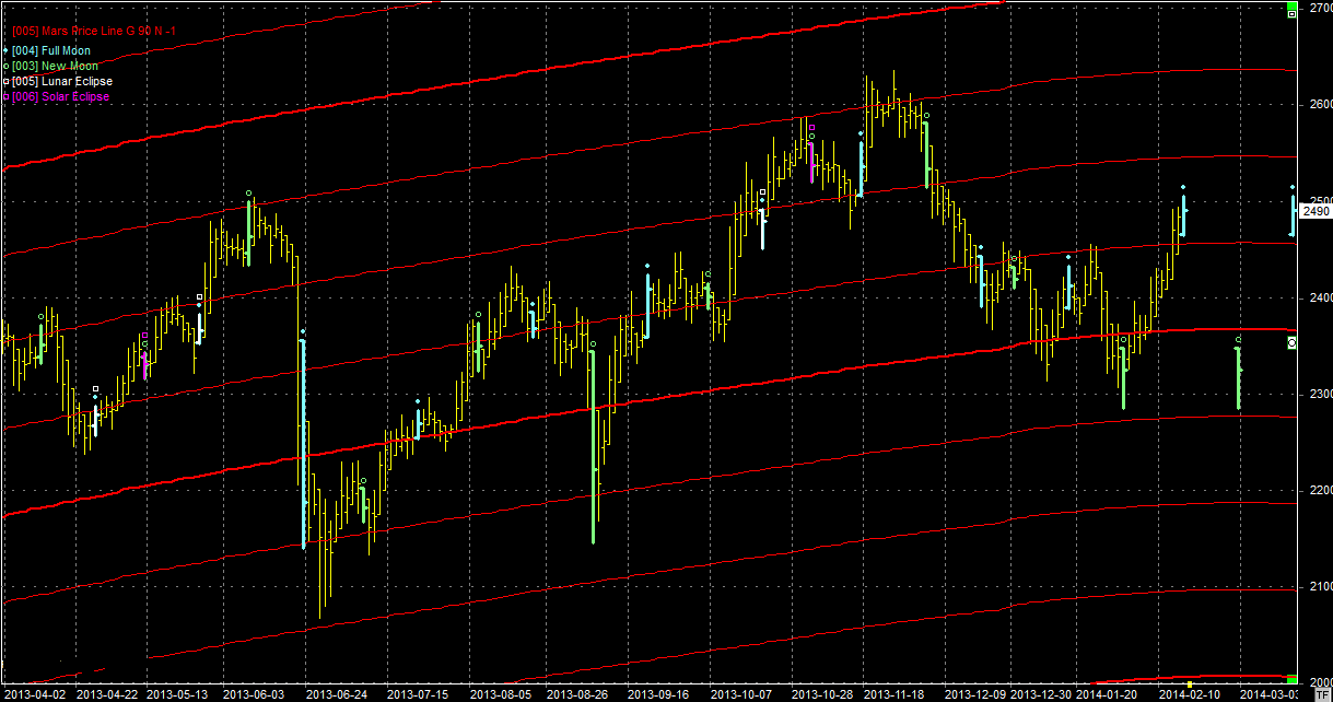 Na wykresie z liniami Marsa bykom udało się przebić opór na poziomie 2460 pkt. Wszystko byłoby pięknie gdyby nie sobotnia pełnia, która jest elementem zwrotnym. Jeżeli jednak bykom uda utrzymać się nad oporem, mimo tego elementu to będzie to byczy sygnał. Następnie opory wyznaczone liniami Marsa to 2550 pkt, a następnie 2630 pkt. Zwracam uwagę, że linie powoli się wypłaszczają i mogą przestać pomagać bykom. W marcu będą skierowane lekko ku dołowi przez jakiś czas.