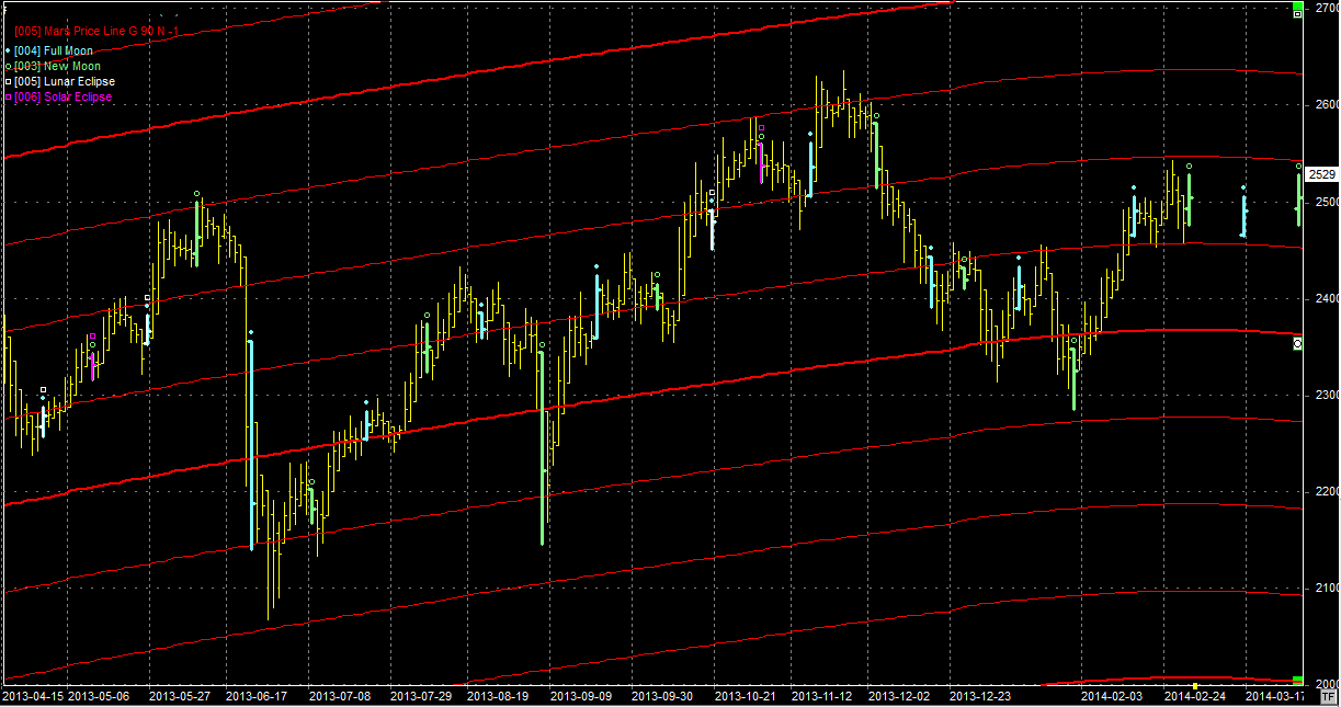 Na wykresie z liniami Marsa mieliśmy dojście do linii oporu na poziomie 2545 pkt i nagły zwrot spadkowy, który uzyskał wsparcie na linii położonej na poziomie 2458 pkt. Od tego poziomu realizujemy odbicie ale nie udało się bykom sforsować oporu. Wygląda na to, że w nadchodzącym tygodniu już się nie uda. Powodem jest sobotni Nów oraz wejście Marsa w ruch wsteczny (retrogradacja). Nów to element zwrotny a retrogradacja Marsa historycznie nie była łaskawa dla byków na naszym parkiecie. Potrwa do 20 maja b.r. Zakładam więc spadek. Nie sądzę przy tym, aby pierwsze wsparcie na 2455 pkt (jest już niżej z uwagi na ruch wsteczny Marsa) obroniło się tym razem. Wg mnie walka za jakiś czas przeniesie się na niższe, położone w okolicach 2380 pkt. W dłuższym terminie nie wykluczam, że kolejny nów będziemy witali w okolicach tego z 30 stycznia.