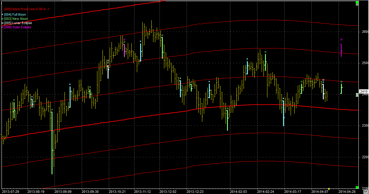 Na wykresie z liniami Marsa zmierzamy ku wsparciu na poziomie 2350 pkt. Pełnia i zaćmienie Księżyca wyznaczyły co prawda dołek ale daje niewielkie szanse na jego utrzymanie się. Wg mnie rynek dotrze do linii położonej na 2350 pkt, a tam zdecyduje się sytuacja w dłuższym terminie. Ciekawie również wygląda przyszły tydzień, gdyż 29.04 mamy nów na zaćmieniu Słońca. W okolicach tej daty również można doszukiwać się zwrotu na rynku.