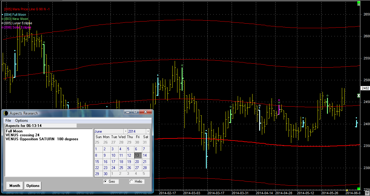 Na wykresie z liniami Marsa kontrakty pokonały opór na poziomie 2450 pkt i obecnie podążają w kierunku kolejnej linii Marsa, położonej w okolicach 2530 pkt. Czas mają do piątku, 13.06, kiedy to mamy na niebie pełnie Księżyca jako element zwrotny.