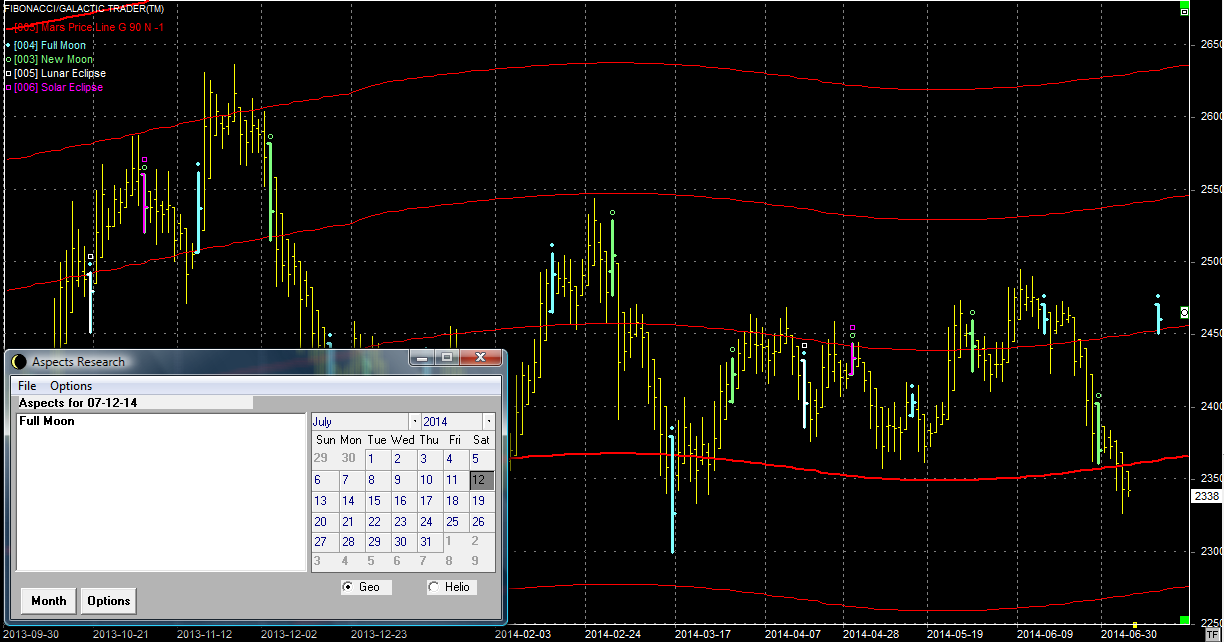 na wykresie z liniami Marsa liczyłem na odbicie na nowiu. Niestety zrealizowało się tylko krótkie zatrzymanie. Obecnie kontrakty naruszyły wsparcie na poziomie 2350 pkt, ale nie jest to naruszenie znaczące. Uważam, że ciągle powinna toczyć się o nie walka i powinniśmy zobaczyć choćby niewielkie odreagowanie. Pogłębienie zeszłotygodniowych minimów na koniec tygodnia trzeba będzie uznać za przełamanie wsparcia. Następne jest w okolicach 2270 pkt.