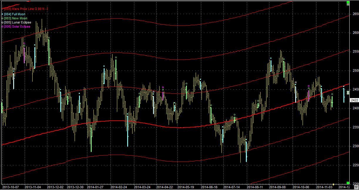 Na wykresie z liniami Marsa nadal pozostajemy w zawieszeniu. Linia na poziomie 2450 pkt. jest przełamana ale pogłębienia spadków do następnego wsparcia nie ma. Wg mnie może to oznaczać chęć przynajmniej przetestowania tej linii od dołu. Rezultat tego testu pokaże kierunek na dłużej. Niedawny nów mógł wyznaczyć krótkoterminowy dołek.