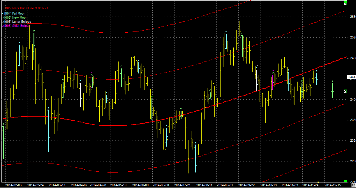 Na wykresie z liniami Marsa mamy ponowne testowanie od dołu przełamanego wsparcia na poziomie ok 2450 pkt. To plus dla byków ale minusem jest sobotnia pełnia, która jest elementem zwrotnym. Jeżeli zadziała to nici z Mikołaja. W takim przypadku powinien czekać nas ruch w okolice wsparcia na linii Marsa przebiegającej obecnie w okolicach 2350 pkt. Linia ta jednak zakrzywiona jest ku górze, gdyż Mars jest w ruchu prostym. W zależności od dynamiki ruchu rynek może uzyskać wsparcie nico wyżej. Z drugiej strony, jeżeli bykom uda się pokonać poziom oporu na 2450 pkt, to następna linia jest dopiero na poziomie 2560 pkt. i również "ucieka" ku górze. Sezon nie sprzyja spadkom, więc pełnia może zostać zignorowana. Patrzmy więc na 2450 pkt. To klucz do dalszego kierunku ruchu.