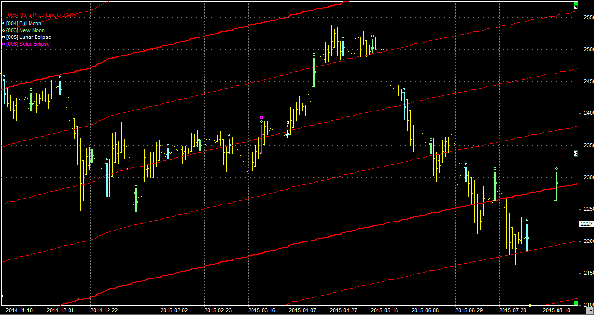 Na wykresie z liniami Marsa weekendowa pełnia powinna być elementem zwrotnym. Jeżeli taj jest w istocie to powinniśmy odbijać od wsparcia położonego na linii Marsa w okolicach 2190 pkt. Następny opór na linii Marsa położony jest ok 100 pkt wyżej. Przełamanie ostatnich dołków będzie oznaczać ruch do okolic 2100 pkt.