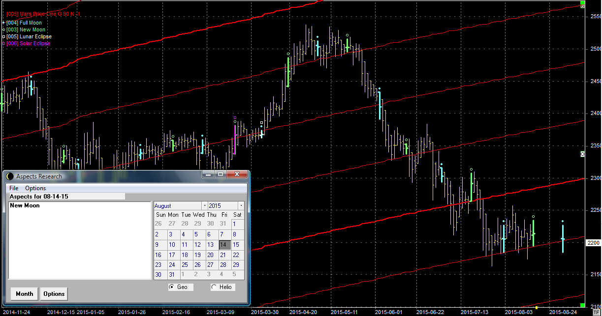 Na wykresie z liniami Marsa sytuacja nie uległa zmianie. Nadal bronione jest wsparcie na poziomie 2200 pkt. Do tej pory nie wyglądało ono przekonująco ale może piątkowy nów zmieni sytuację? Jest to element zwrotny więc powinien działać na korzyść byków. Jeżeli tak, to można spodziewać się ruchu w okolice 2300 pkt. Przełamanie wsparcia natomiast zaowocuje ruchem w okolice 2110 pkt.