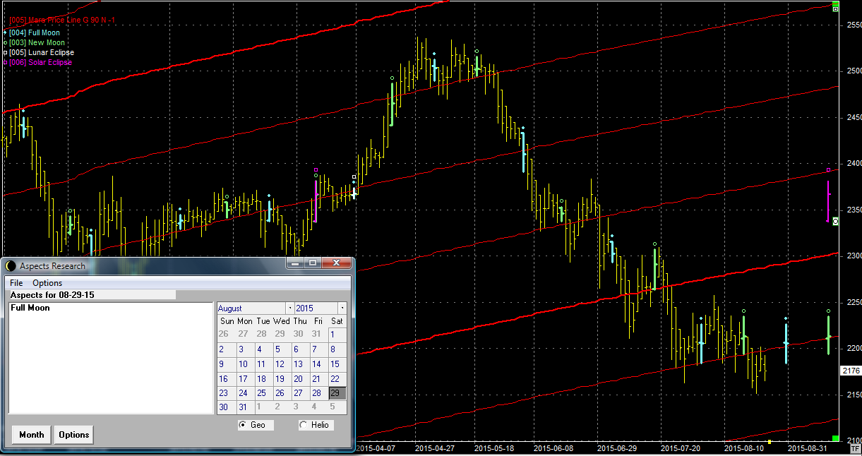 Na wykresie z liniami Marsa byki utraciły wsparcie w okolicach 2200 pkt. Obecnie można spodziewać się kontynuacji ruchu spadkowego w okolice wsparcia na linii Marsa na poziomie 2120 pkt. Czasu jest cały tydzień bowiem pełnia, która może przynieść zwrot jest dopiero w sobotę 29.08.15.