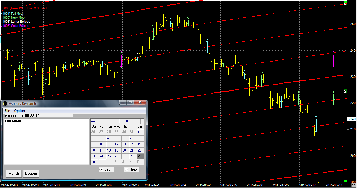 Na wykresie z liniami Marsa kurs kontraktów dotarł do oporu na linii położonej w okolicach 2140 pkt. Do tego w sobotę była pełnia, która jest elementem zwrotnym. To wszystko każe oczekiwać zakończenia korekty wzrostowej i kontynuacji spadków do okolic poprzedniego wsparcia. Wtedy byłaby szansa na utworzenie podwójnego dna i dłuższą falę wzrostową. Bez tego ruch wzrostowy jest prowadzony bez "uklepania" dna, a przez to jest narażony na gwałtowne, emocjonalne zmiany. Gdyby jednak bykom przyszła fantazja tak prowadzić ruch dalej, to następny opór jest na poziomie 2210 pkt. Następny nów jest na zaćmieniu Słońca.