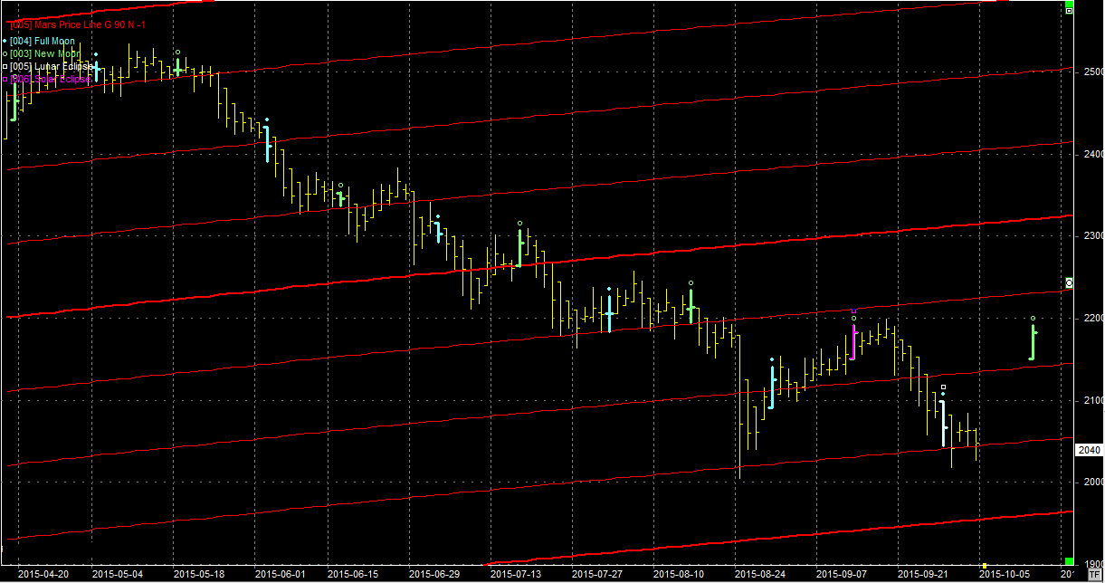 Na wykresie z liniami Marsa widać dokładnie gdzie stoimy. Wsparcie, jeżeli wytrzyma, spowoduje ruch przynajmniej w okolice pierwszego oporu, czyli 2150 pkt. Przełamanie to spadek co najmniej do poziomu 1950 pkt. W razie paniki 100 pkt niżej.