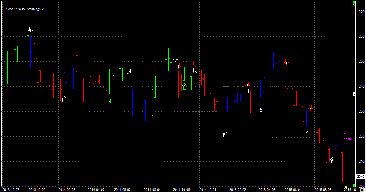System utrzymuje dwie krótkie pozycje po 2085 pkt. Pozycja zgodna z trendem głównym. Stop na poziomie 2200 pkt.