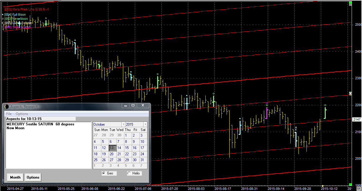 Na wykresie z liniami Marsa mamy zapowiadane odbicie od wsparcia na poziomie 2050 pkt. i ruch w kierunku oporu na poziomie 2150 pkt. Obecnie opór jest testowany. Nie wróżę jego przebicia gdyż już we wtorek mamy nów, a więc element zwrotny. Powinien on prowokować do korekty. Jeżeli mamy pokonać ww. opór to pewnie stanie się to za drugim podejściem.
