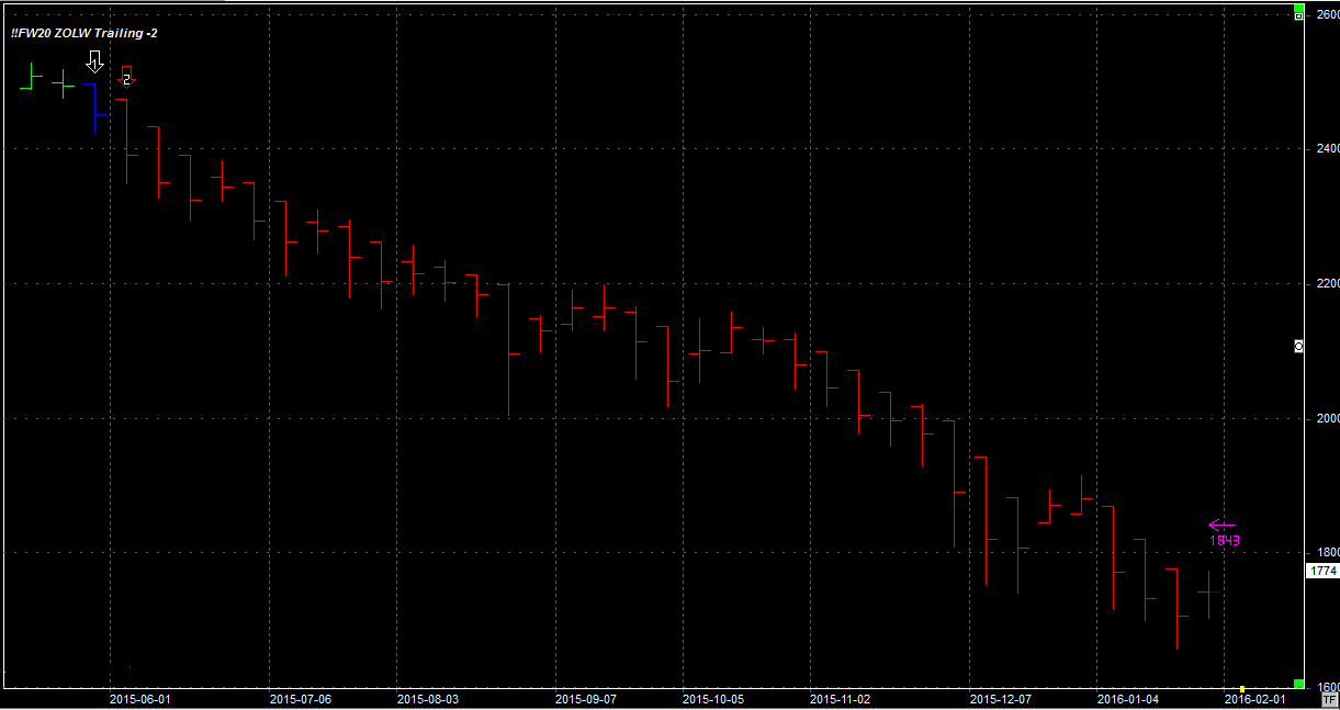 System utrzymuje dwie krótkie pozycje po 2085 pkt. Pozycja zgodna z trendem głównym. Stop na poziomie 1843 pkt.