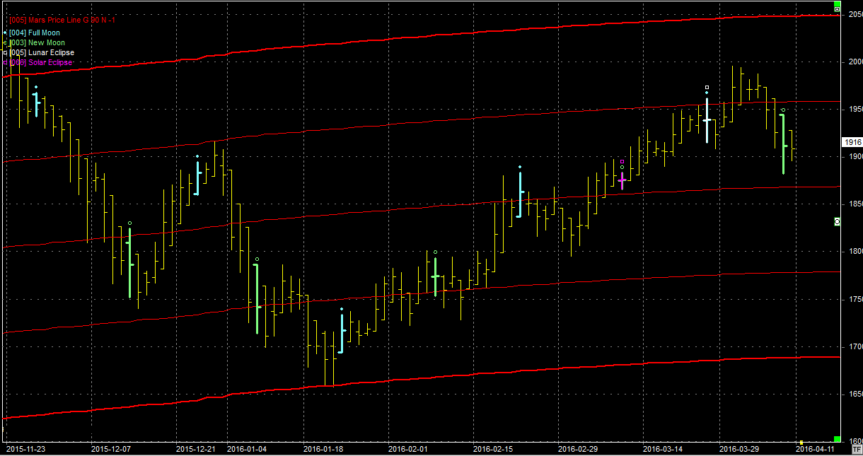 Na wykresie z liniami Marsa bykom nie udało się jednak utrzymać nad oporem na poziomie 1960 pkt. Obecnie wsparcie mamy na linii położonej w okolicach 1870 pkt. Dojście tam wydaje się logiczne i jeszcze nie zmieni przewagi byków na wykresach. Dopiero niższe zejście będzie groźne i może znamionować koniec korekty wzrostowej, zapoczątkowanej w styczniu b.r. Istnieje też możliwość, że zeszłotygodniowy nów wyznaczył dołek. Jeśli tak, to rynek zawrócił nad wsparciem.