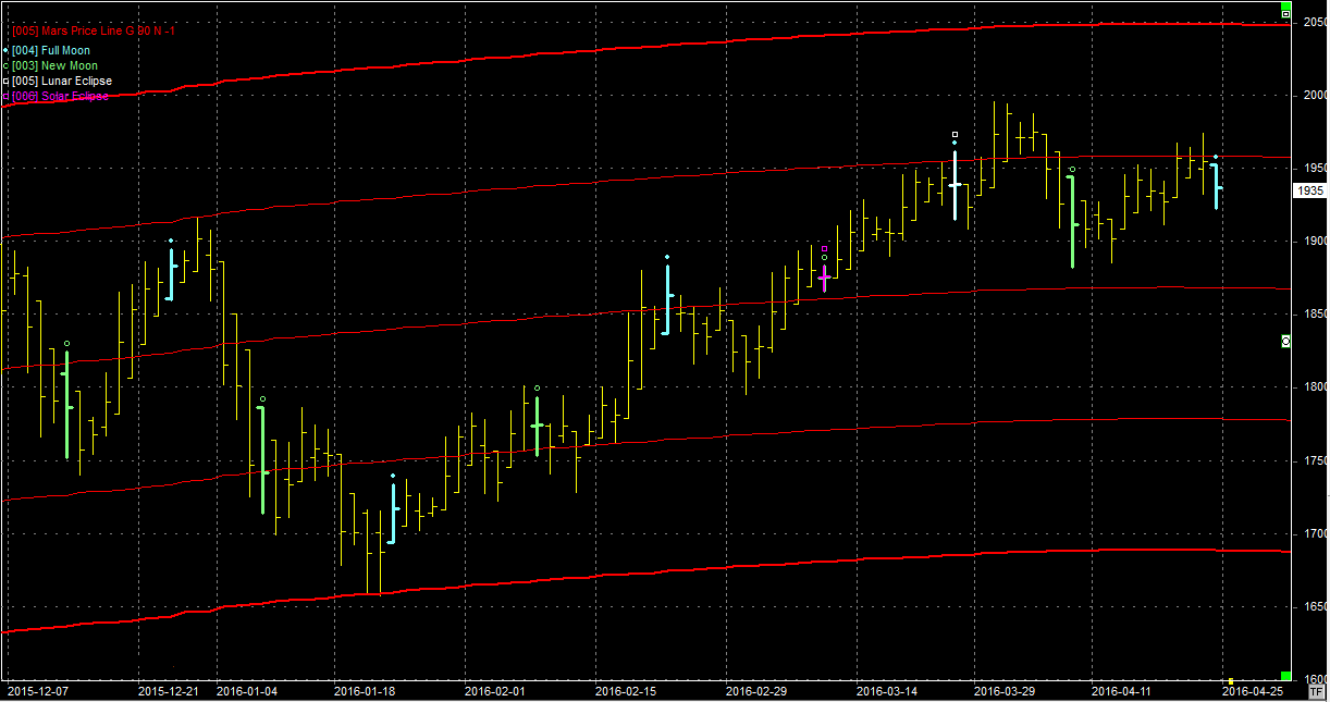 Na wykresie z liniami Marsa ostatnia pełnia wyznaczyła zwrot i odejście od oporu. Obecnie wydaje się, ze byki nie mają już siły na przebicie linii położonej w okolicach 1950 pkt. Zwłaszcza, że przy ruchu wstecznym Marsa linia ta będzie się opuszczała. Wydaje się wiec zasadne przetestowanie wsparcia na poziomie 1870 pkt. i dopiero po jego pozytywnym wyniku kolejny atak na opór.