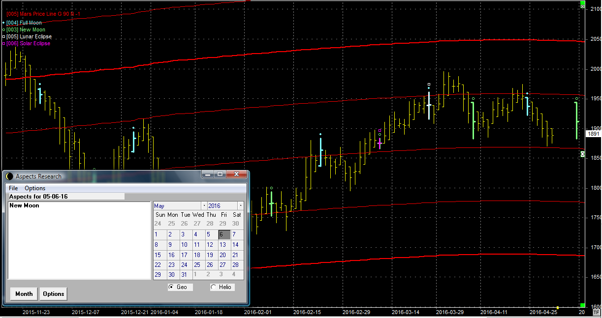 Na wykresie z liniami Marsa testujemy linię na poziomie 1860 pkt. Tu powinno pojawić się jakieś odbicie, które zostało zainicjowane już w czwartek. Idealnie do nowiu powinniśmy uklepywać dno, a przy nowiu w piątek zapoczątkować ruch wzrostowy. To jeśli uda się obronić wsparcie. Jeśli nie, to spadać będziemy do piątku. Dużo sesji nie ma, więc nie wiem czy uda się niedźwiedziom dotrzeć do linii położonej poniżej 1800 pkt. Trochę mało czasu ale przy dobrych wiatrach...