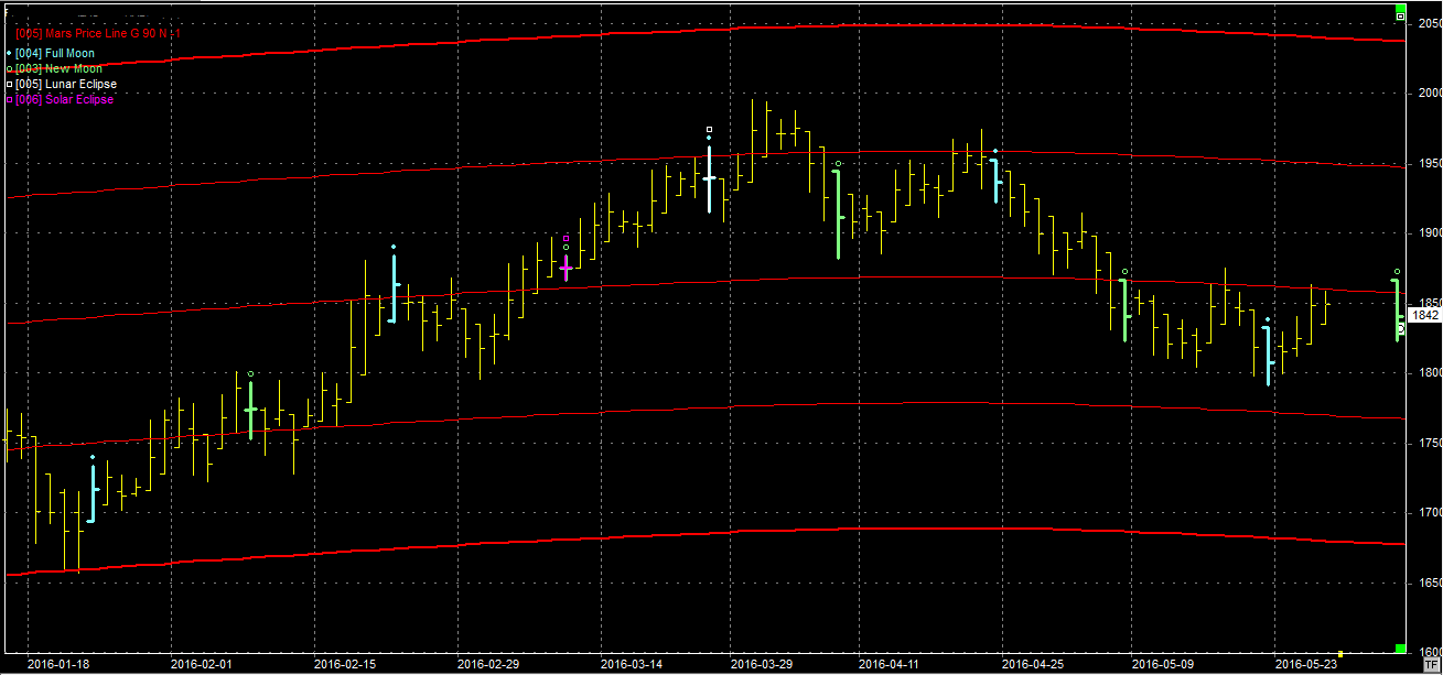 Na wykresie z liniami Marsa widzimy zapowiadane odbicie na pełni. Dotarło ono do pierwszego oporu, położonego na linii Marsa w okolicach 1860 pkt. Oddziaływanie tego oporu widzieliśmy już w środę, kiedy to rynek zaczął kreślić korektę. To normalne zachowanie. W nadchodzącym tygodniu byki jednak powinny zacząć pracować na wybicie. Głębsze zejście może wprowadzić niepokój i zwiększyć podaż. Następny aspekt zwrotny to nów 5.06. Do tego czasu byki muszą uporać się z oporem, jeśli myślą o trwalszym odbiciu. Jeśli się to nie uda to czeka nas zejście do linii położonej na poziomie 1760 pkt.