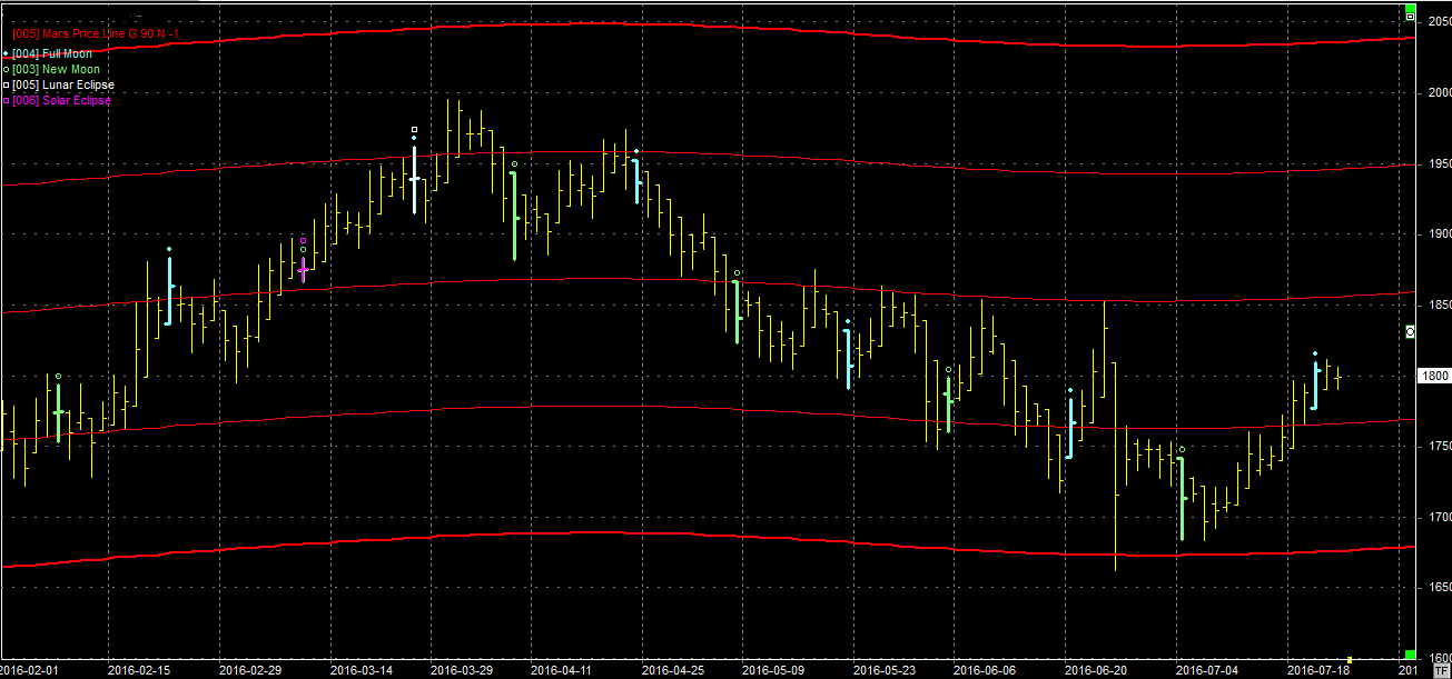 Na wykresie z liniami Marsa widzimy, że byki nie czekały na nic, tylko zabrały się do forsowania linii oporu na poziomie 1770 pkt. i są obecnie ponad nią. Maksima rynek ustanowił w dniu pełni, więc jej oddziaływanie zwrotne nadal jest możliwe. Powinniśmy zobaczyć przynajmniej test przełamanego oporu od góry. Jeśli będzie pozytywny to wtedy można się zabierać za następny, na poziomie 1860 pkt. Jeśli będzie negatywny to będzie zawód i zwiększona podaż.