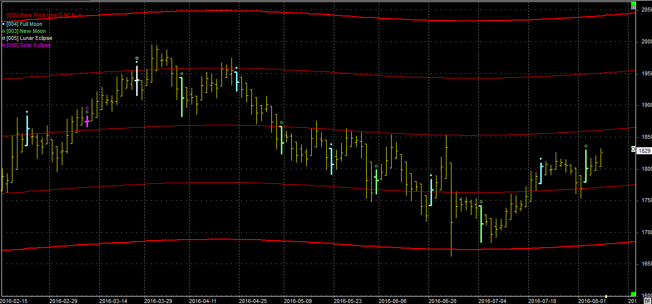 Na wykresie z liniami Marsa widzimy zapowiadany test przełamanego wcześniej oporu, który obecnie jest wsparciem. Ruch spadkowy dotarł do tej linii ponownie od góry i na tym spadki powinny się zakończyć. Być może walka potrwa jeszcze do nowiu, który wypada we wtorek 02.08.16. W tym okresie nastąpić powinien zwrot.