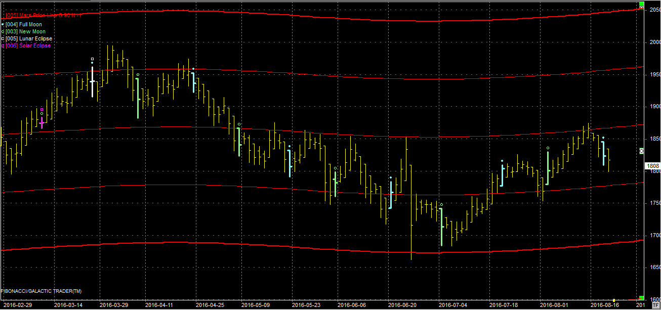 Na wykresie z liniami Marsa widać, że dotarliśmy do oporu na poziomie 1860 pkt. Do tego w czwartek jest pełnia, a w poniedziałek nie ma handlu. Powinniśmy zacząć korektę w tych warunkach. Być może pobujamy się przy maksimach do czwartku, a na pełni zawrócimy. Możliwy zasięg korekty to połowa zakresu pomiędzy liniami lub nawet linia na poziomie 1780 pkt.