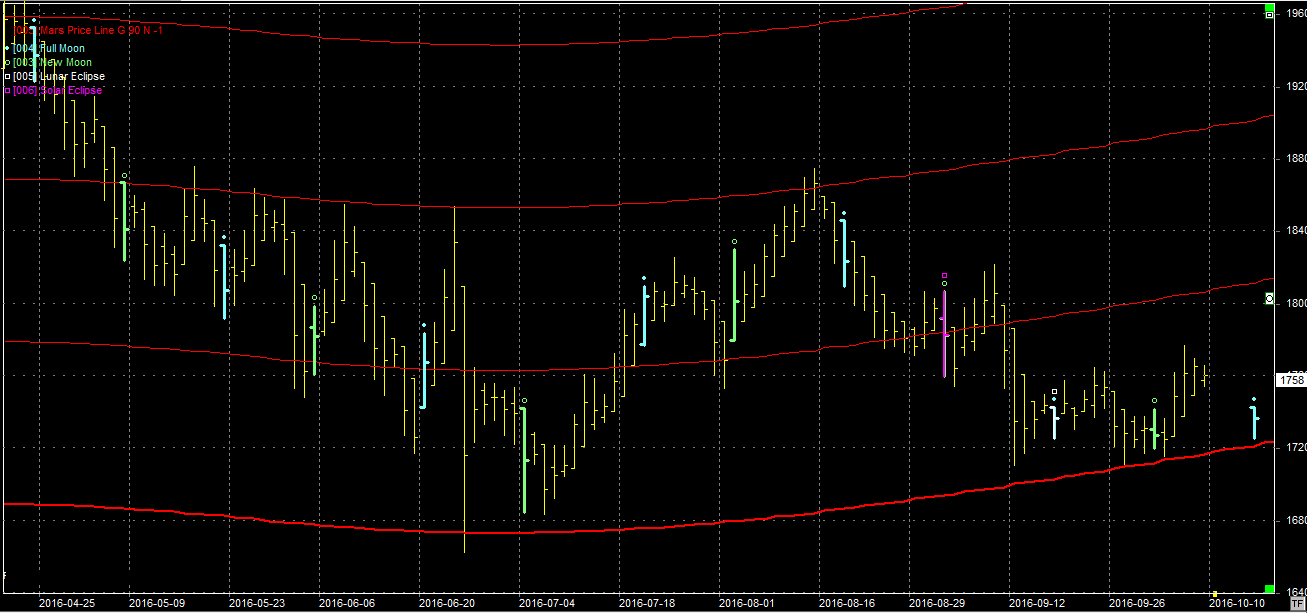 Na wykresie z liniami Marsa ponownie szorujemy okolice wsparcia na linii położonej na poziomie 1710 pkt. Powinniśmy odbijać, zwłaszcza że w sobotę był nów, który powinien pomagać w zmianie tendencji, przynajmniej w krótkim okresie.