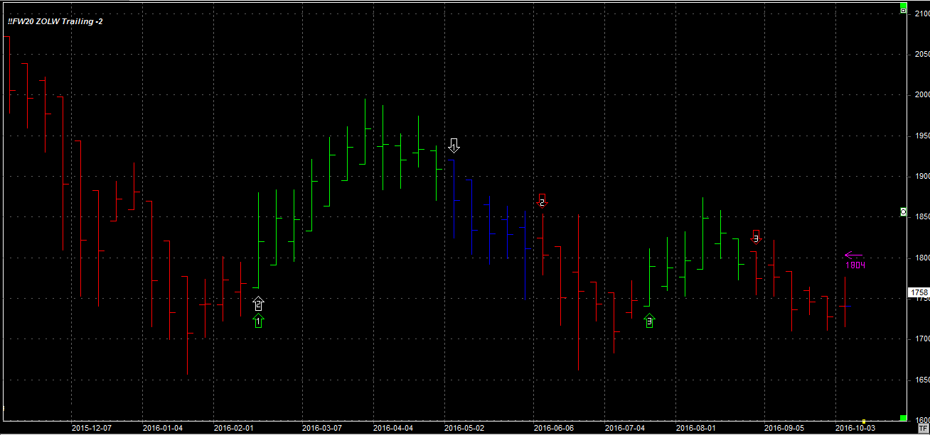 Tydzień zamknął się na poziomie 1758 pkt., 36 pkt. wyżej niż tydzień temu. System utrzymuje dwie pozycje krótkie, zgodne z trendem, po 1765 pkt. Stop dla pozycji 1804 pkt.