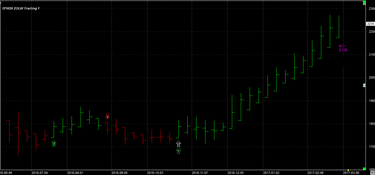 Tydzień zamknął się na poziomie 2235 pkt., 22 pkt. wyżej niż tydzień temu. System utrzymuje pozycję długą 1 szt. po 1817 pkt. Stop dla pozycji 2118 pkt.