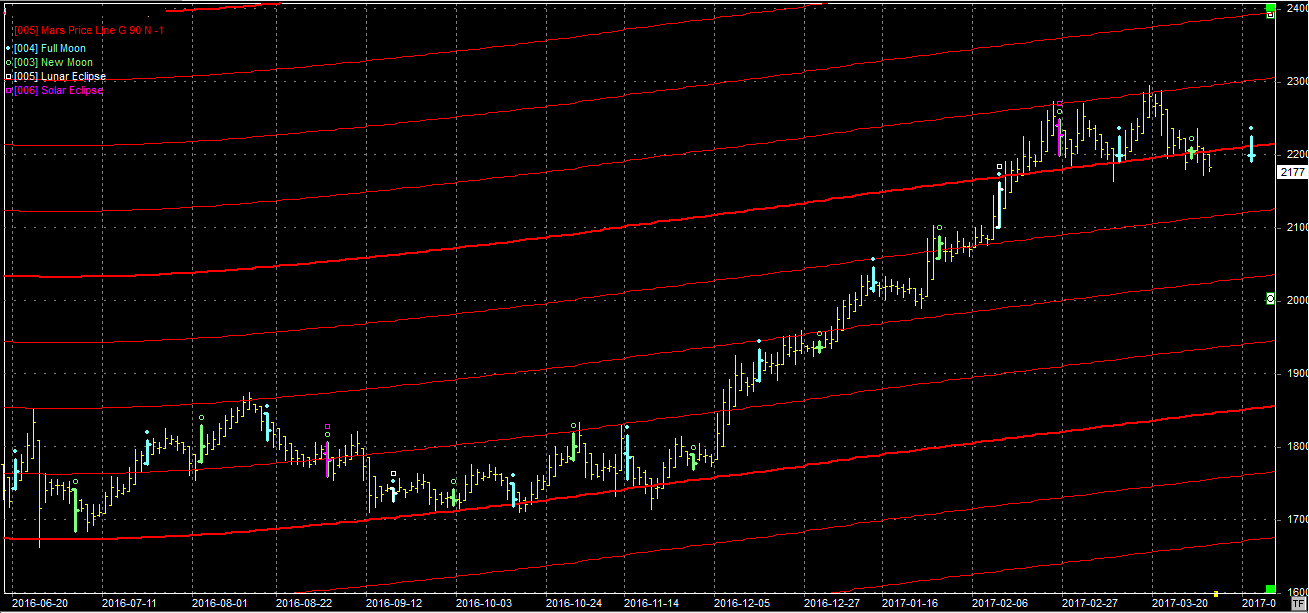 Na wykresie z liniami Marsa widać, że linia Marsa znajdująca się obecnie na poziomie 2300 pkt. stanowi opór nie do przebicia przez byki. Trzeci atak na tę linię zakończył się kontratakiem podaży. Obecnie kurs jest na wsparciu na poziomie linii Marsa w okolicach 2200 pkt. Możemy się więc jeszcze pobujać w ruchu horyzontalnym. Przebicie wsparcia będzie sygnałem słabnącej pozycji byków, choć w końcu kwartału byłoby to dziwne. Jeśli jednak nie utrzymają wsparcia to należy oczekiwać cofnięcia przynajmniej i jeden poziom, do okolic 2120 pkt. 28.03.17 uściśla się nów. To plus dla byków, gdyż jest to aspekt zwrotny, który może wyznaczyć dołek korekty.