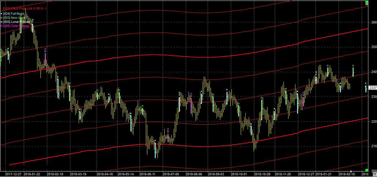 Na wykresie z liniami Marsa widzimy, że byki utraciły kontakt z oporem na poziomie 2380 pkt. Scenariuszem bazowym jest więc zejście do najbliższego wsparcia, w okolicach 2300 pkt. Czas jest do 06.03.19, kiedy to mamy na niebie nów, który może zmienić tendencję.