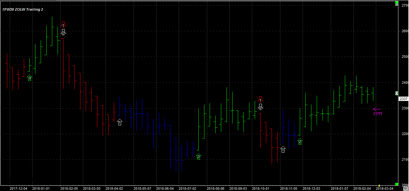 Tydzień zamknął się na poziomie 2337 pkt., 26 pkt. niżej niż tydzień temu. System utrzymuje dwie długie pozycje (zgodnie z trendem) po 2295 pkt. Stop dla pozycji 2299 pkt.