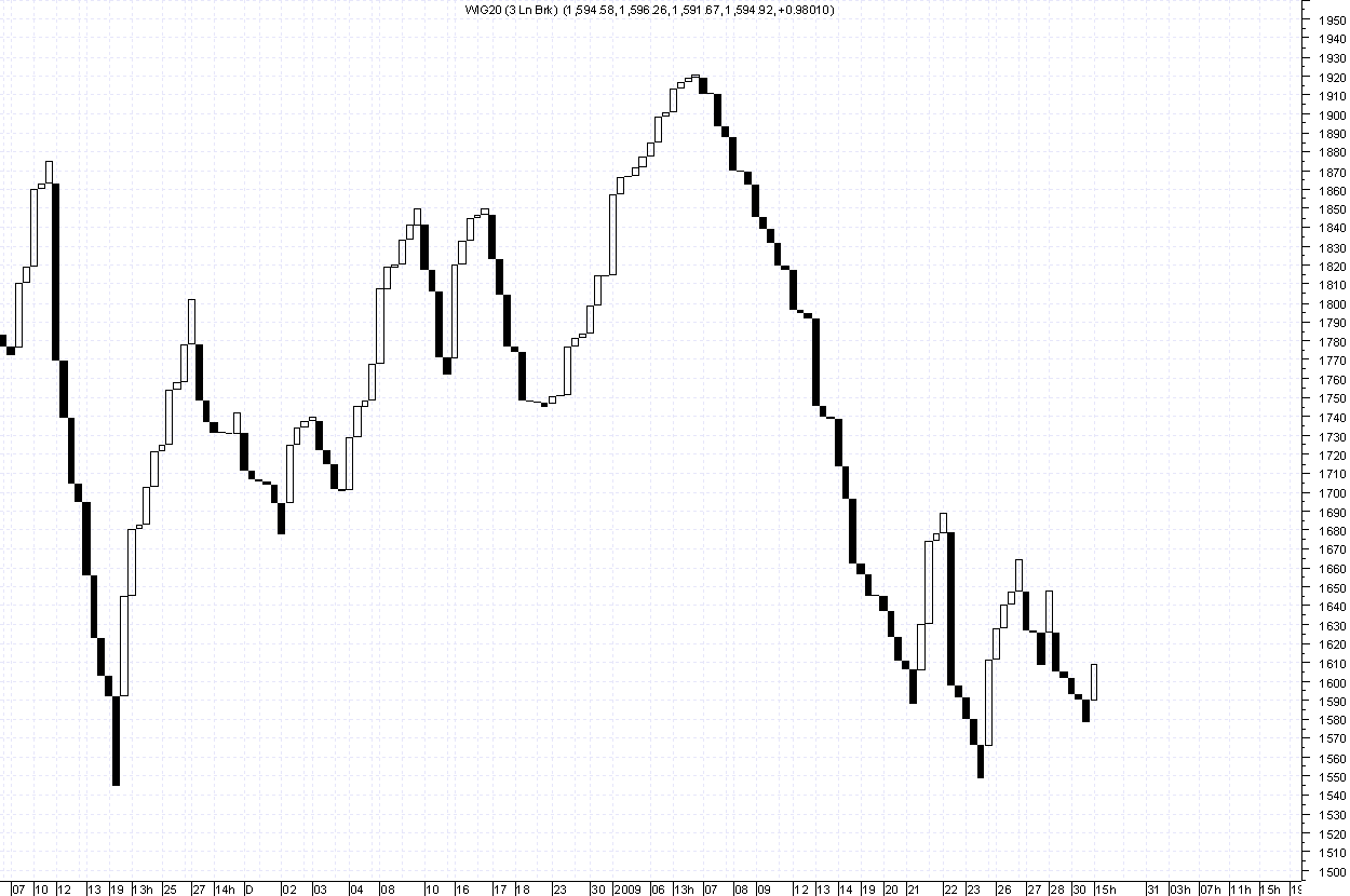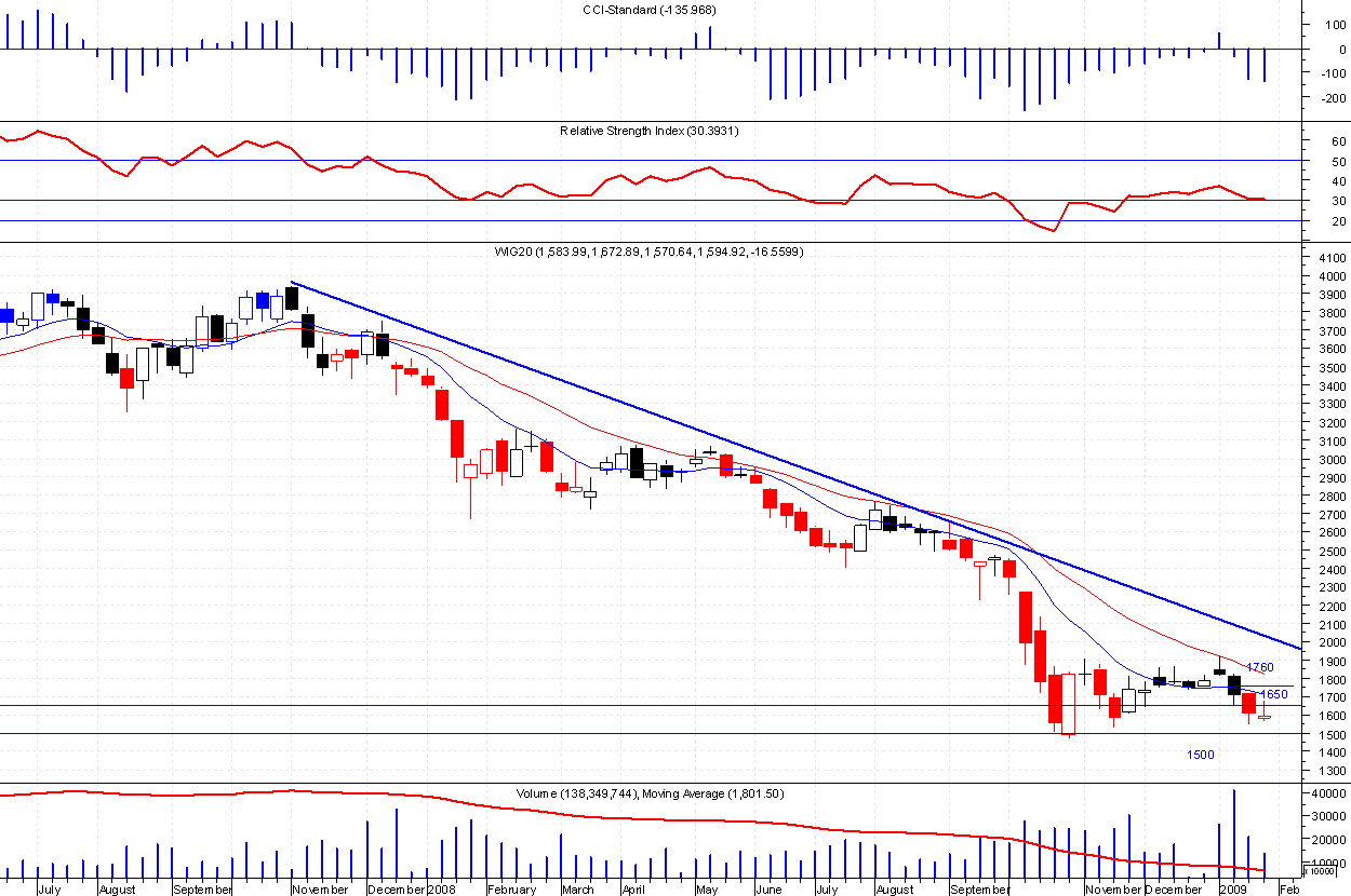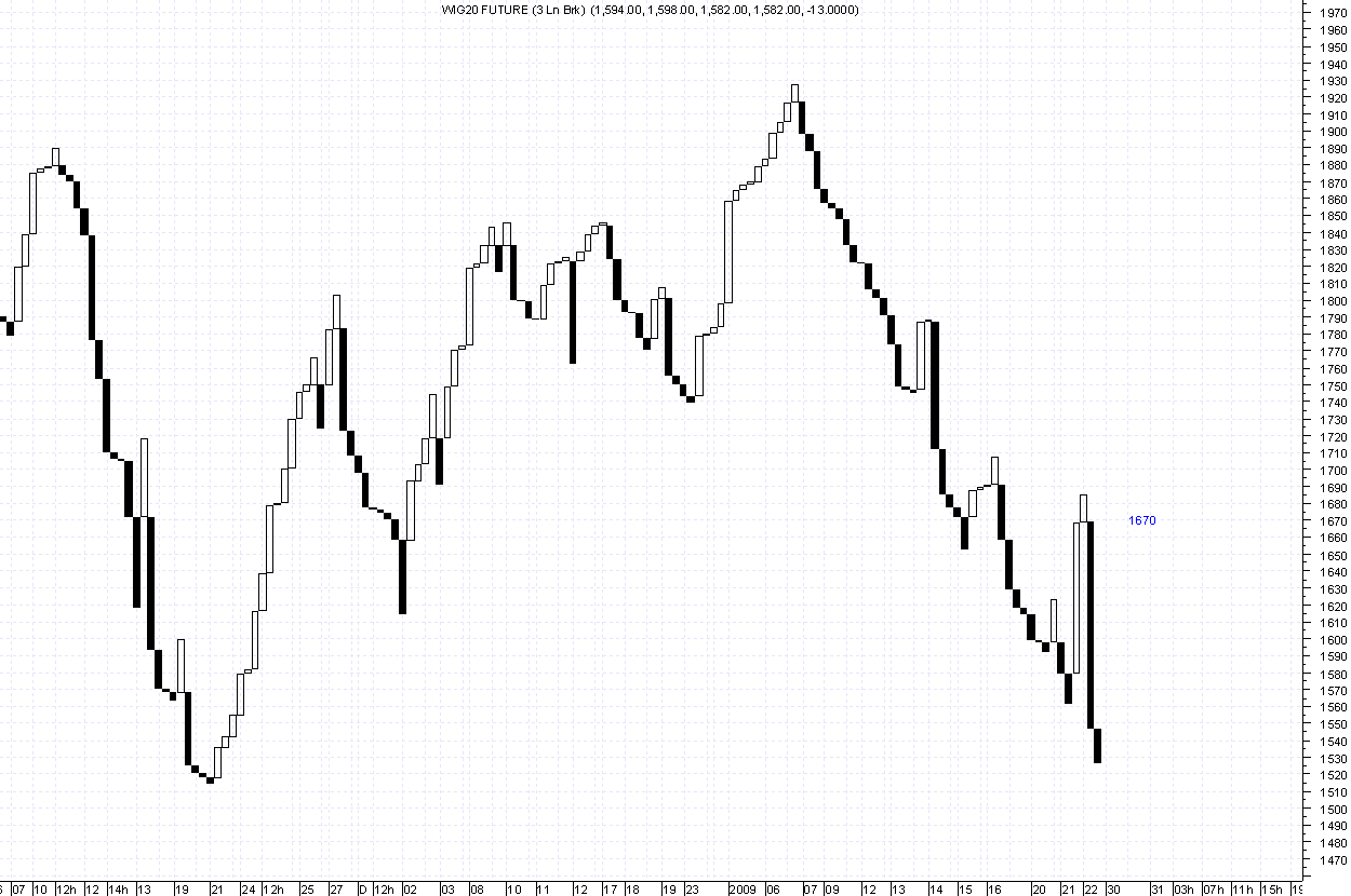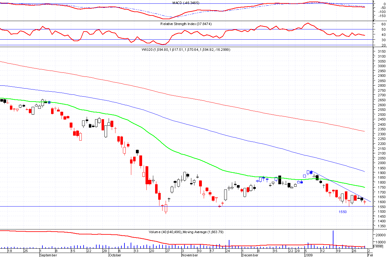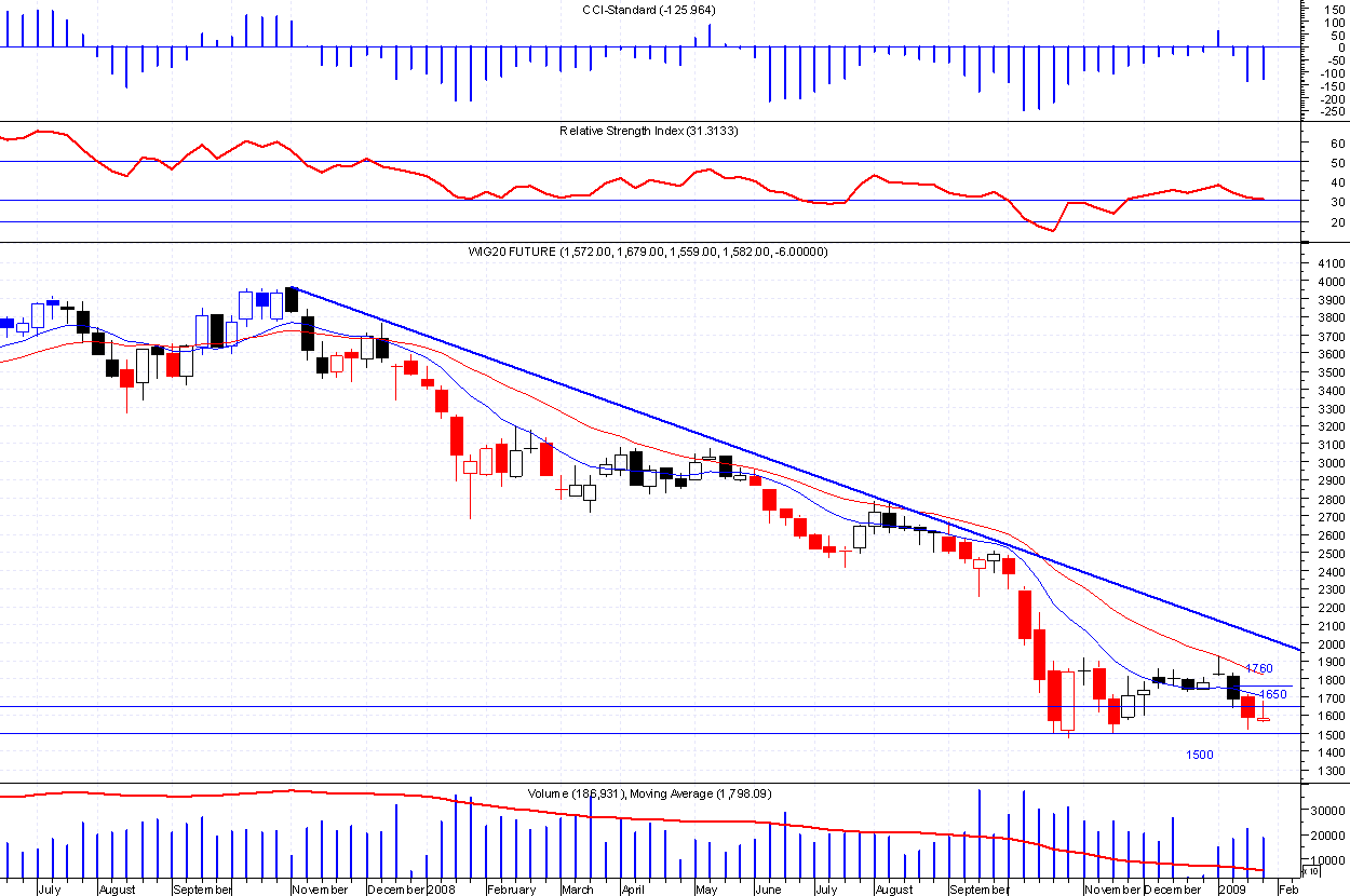 Nieco lepiej wygląda wykres day , gdzie coraz mniejsze korpusy czarnych świec sugerują słabnięcie trendu. Tutaj ważny poziom 1550 pkt. Pokonanie tego i niżej 1500 to już otchłań i trudno przewidziec jak nisko zajdziemy.