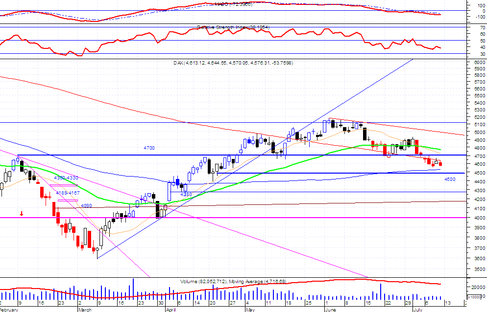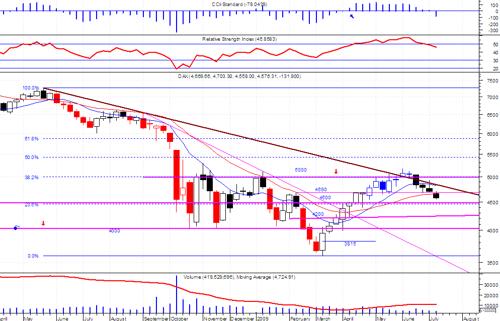 Week: 4 kolejne czarne świece pokazują przewagę sprzedających, wyraźnie widać ,że korekta trendu spadkowego nie była zbyt głęboka i zaszła tylko do 38% zniesienia. Najbliższy tydzień to zapewne powolne osuwanie w kierunku bardzo mocnego wsparcia na 4500 pkt. Możliwe chwilowe odbicie od 200 ma na wykresie kolor czerwony. Naruszenie linii trendu tylko potwierdza słabość popytu.