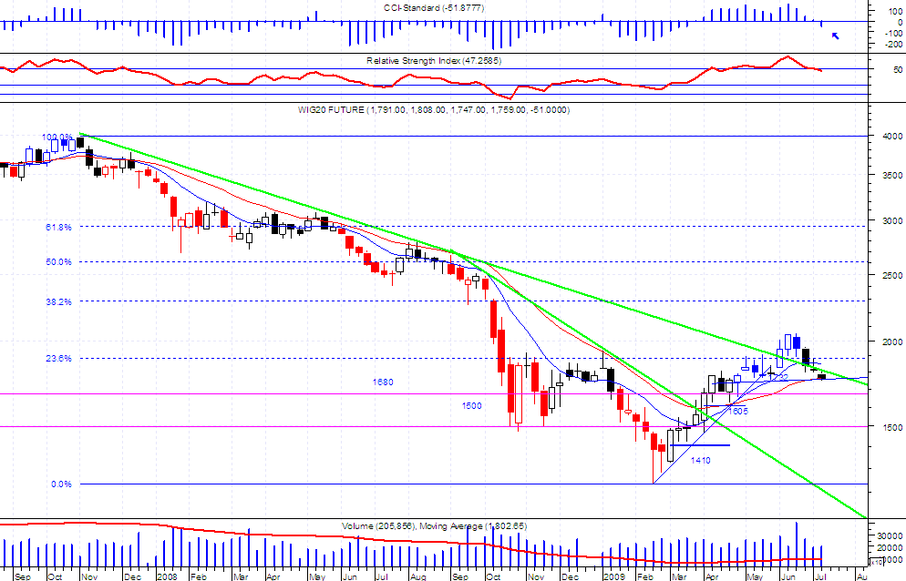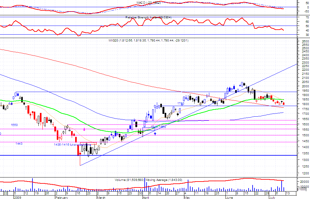 Day: Przełamana linia trendu wzrostowego i powstanie linii trendu spadkowego , która teraz zapewne wyznaczać będzie teraz zasięgi korekty. Cóż w zasadzie wszystko opisane w wykresie tygodniowym, ja spodziewam się osłabienia nawet w okolice 1600 pkt.