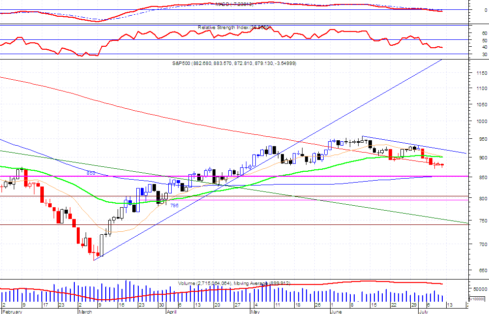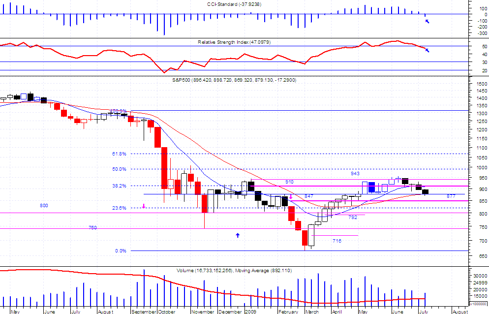 Week : Dwie ostatnie świece potwierdzające przewagę podaży, obecnie jesteśmy na wsparciu na 877 pkt a najpewniej w tym tygodniu będziemy testować poziom 847 pkt. Na średnich sygnał kupna, ale cała korekta nie doszła do 50% zniesienia. Przed nami pewnie powolne osuwanie w dół.