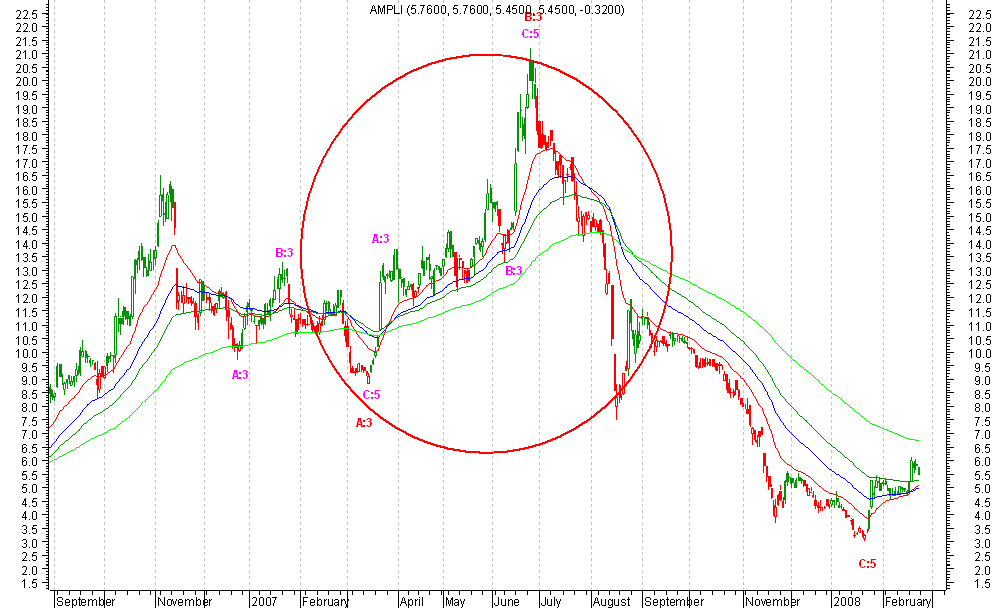 4) Po jej zakończeniu następuje kolejna dość silna fala, która wychodzi powyżej szczytu A:3 a następnie wzrosty są kontynuowane rysując hiperbolicznie zakrzywiony kształt. Tu pojawia się problem, gdyż wzrosty rozpędzają się jak w hiperboli jednak fale są krótkie i często zachodzą na siebie. Po zakończeniu całego ruchu najłatwiej ten ruch oznaczyć jako fala trzecia ale wewnętrzna struktura najczęściej łamie reguły elliotowskie - czasami fale zachodzą na siebie a czasami po prostu nie ma jak rozpisać ten ruch na pięć podfal. W rzeczywistości jest to trójfalowa fala b niższego rzędu. (na rysunku b:3 niebieskie)